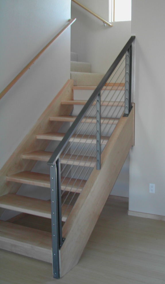 Beautiful Maple open riser stairway with stainless steel cable railing system. |