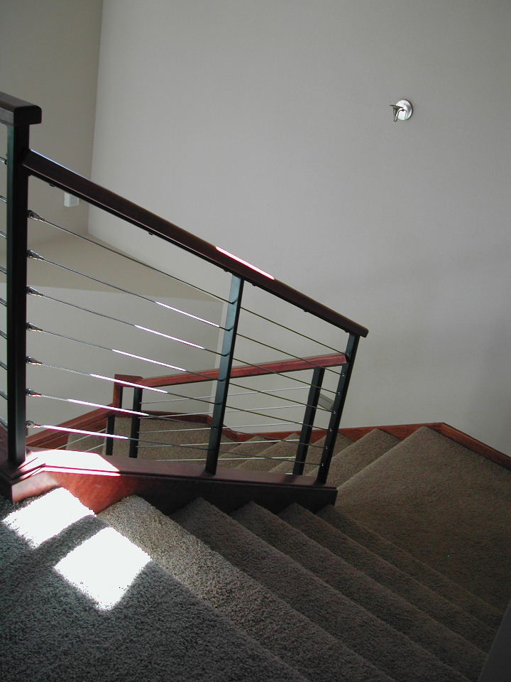Contemporary Cable railing system with Cherry handrail, wall cap, and stair skirting. |