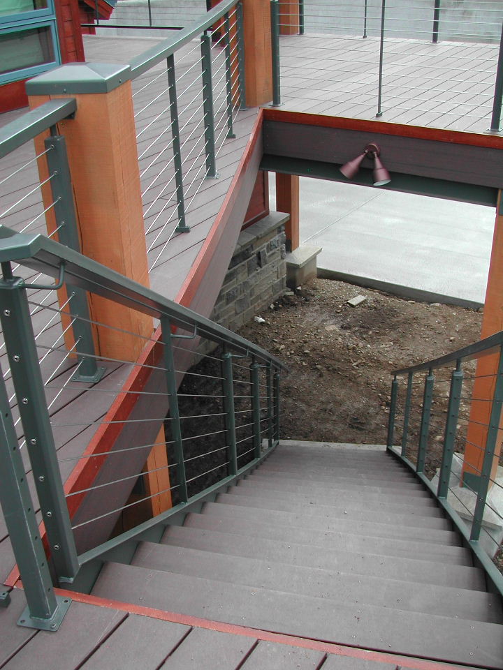 Cable style railing accented with 8" wood posts and steel post caps. |