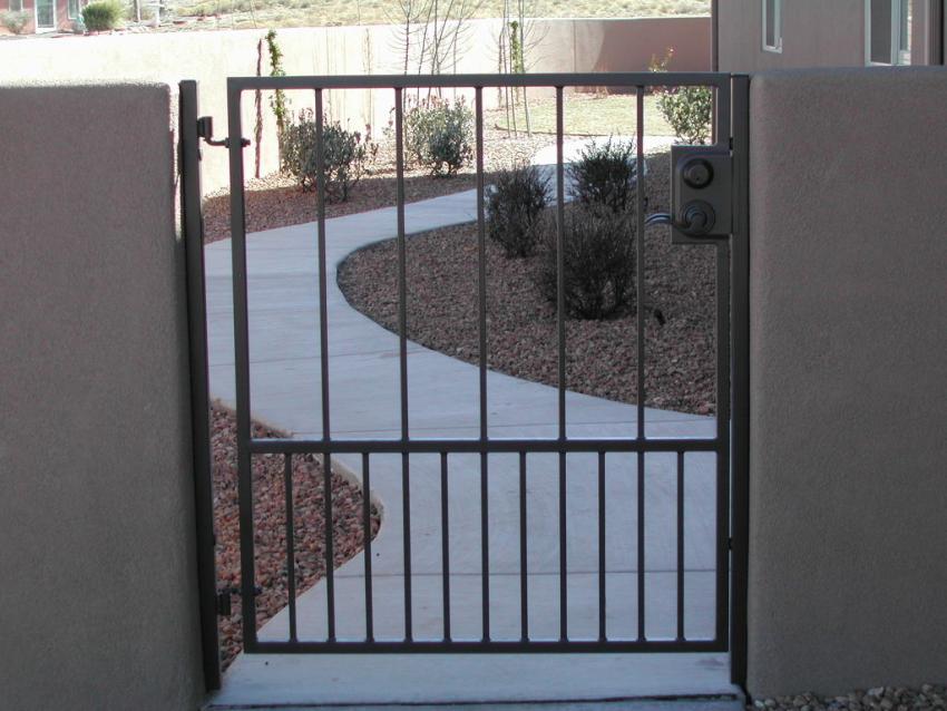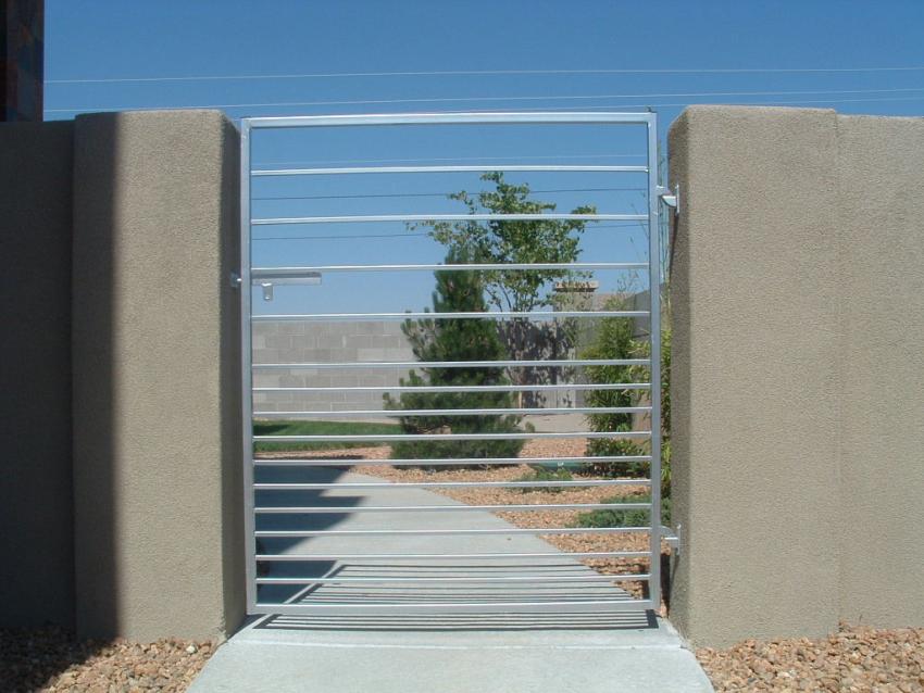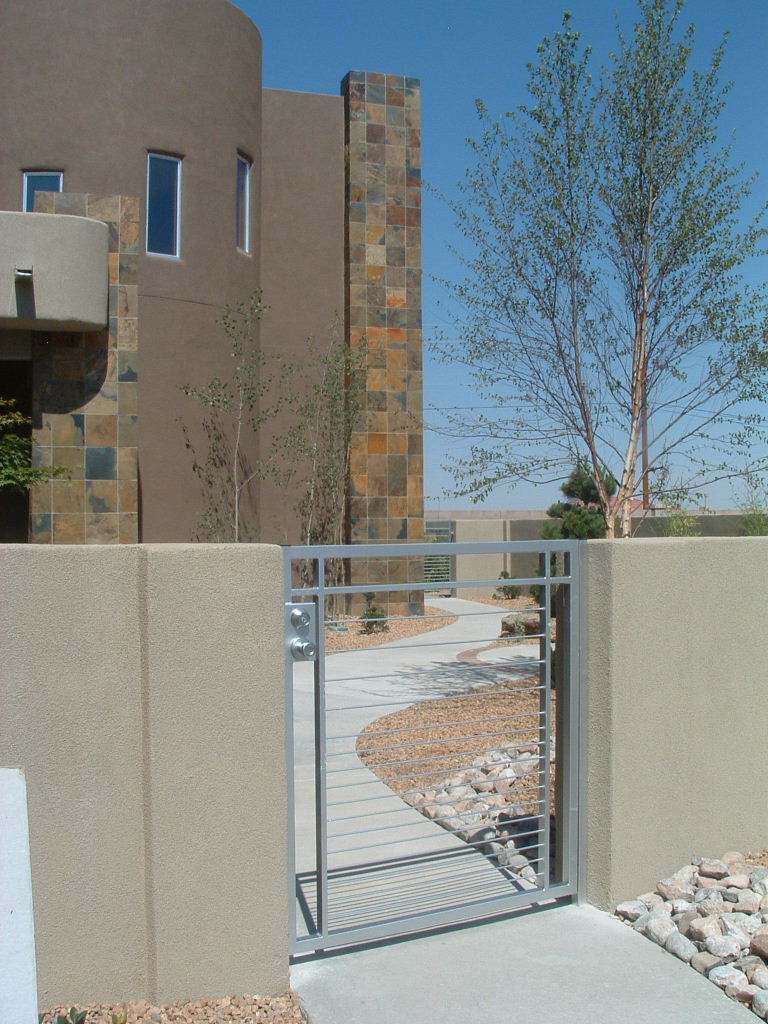 Contemporary entry gate with double lock set~Painted silver. |