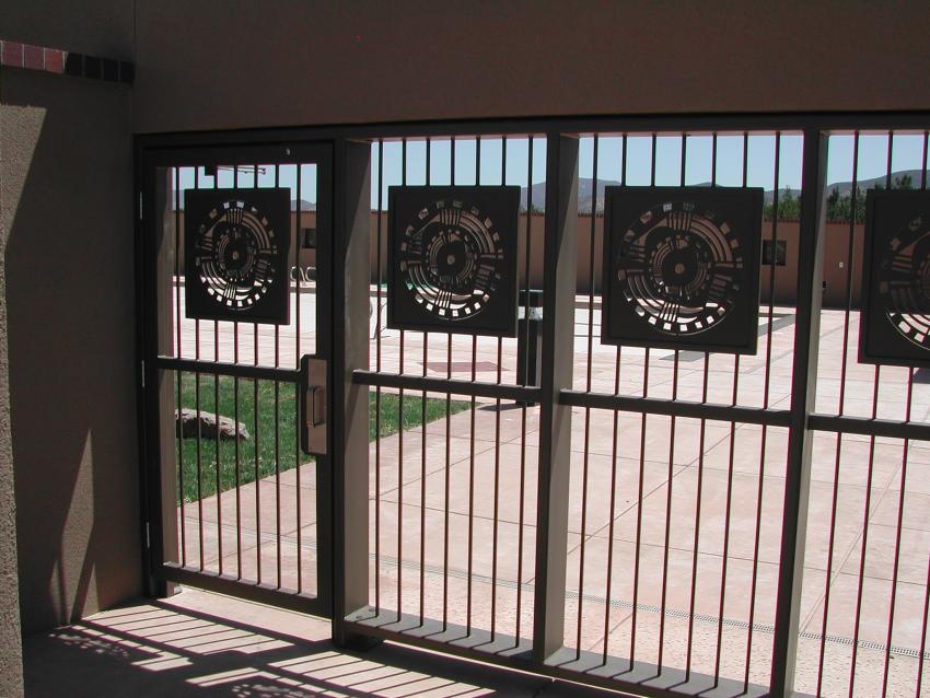 Custom entry gate with geometric and square accents |