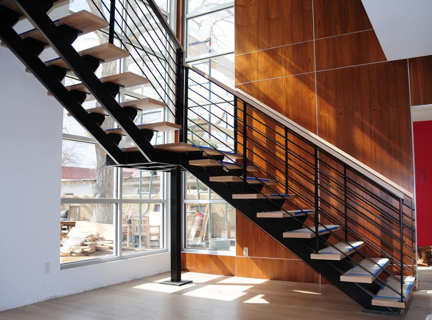 This stairway features Maple treads and open risers with dual steel stringer The sleek, contemporary steel guardrails feature horizontal railing design capped with Maple wood rail. |