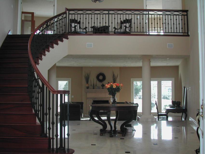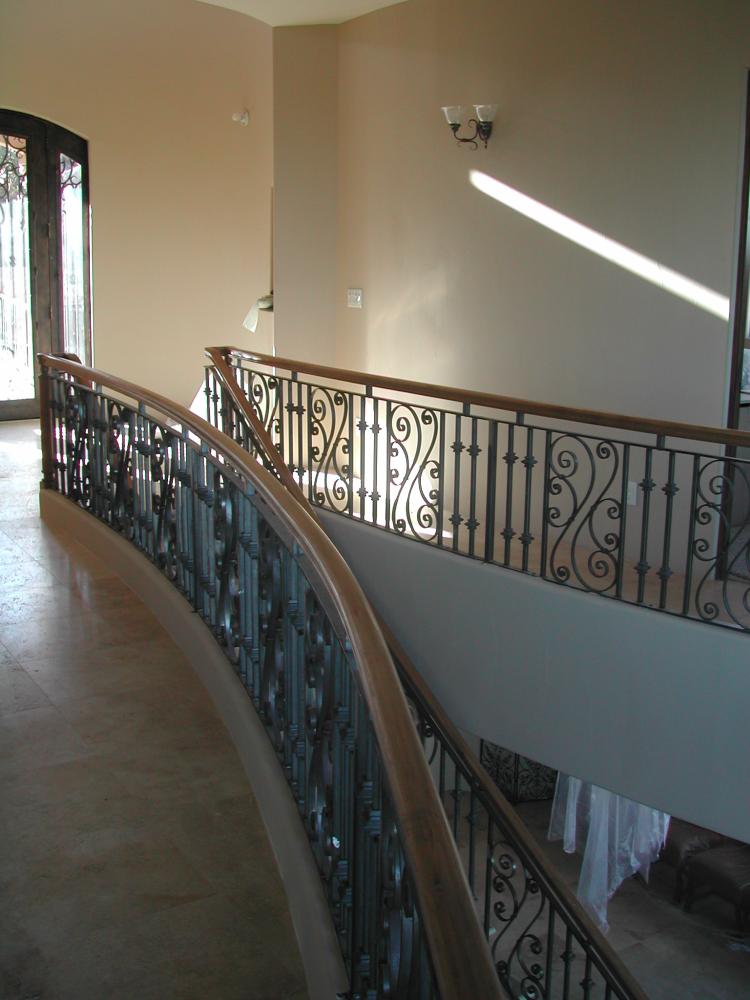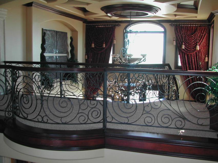 This all welded guardrail features elegant hand forged scroll work~powder coat finish, capped with wood handrail, shoe boards and fascia with decorative wood moulding. |