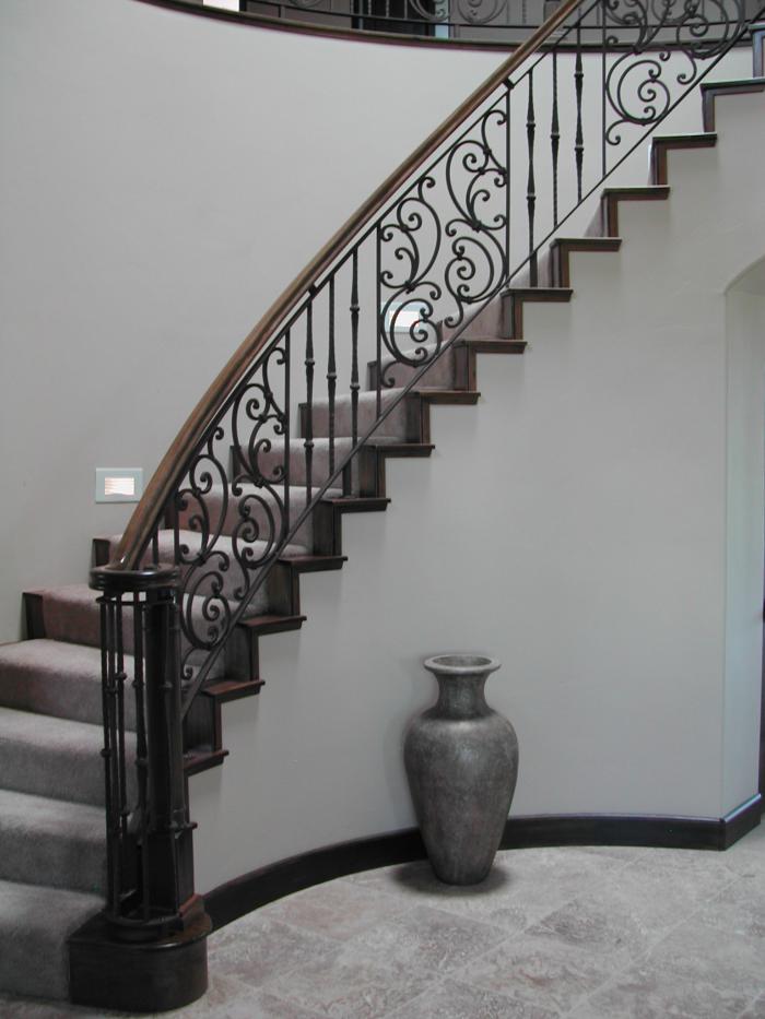 This curved stair features tread and riser end caps on both sides of stairway with beautiful Tuscan welded balustrade~Powder coat finish. |