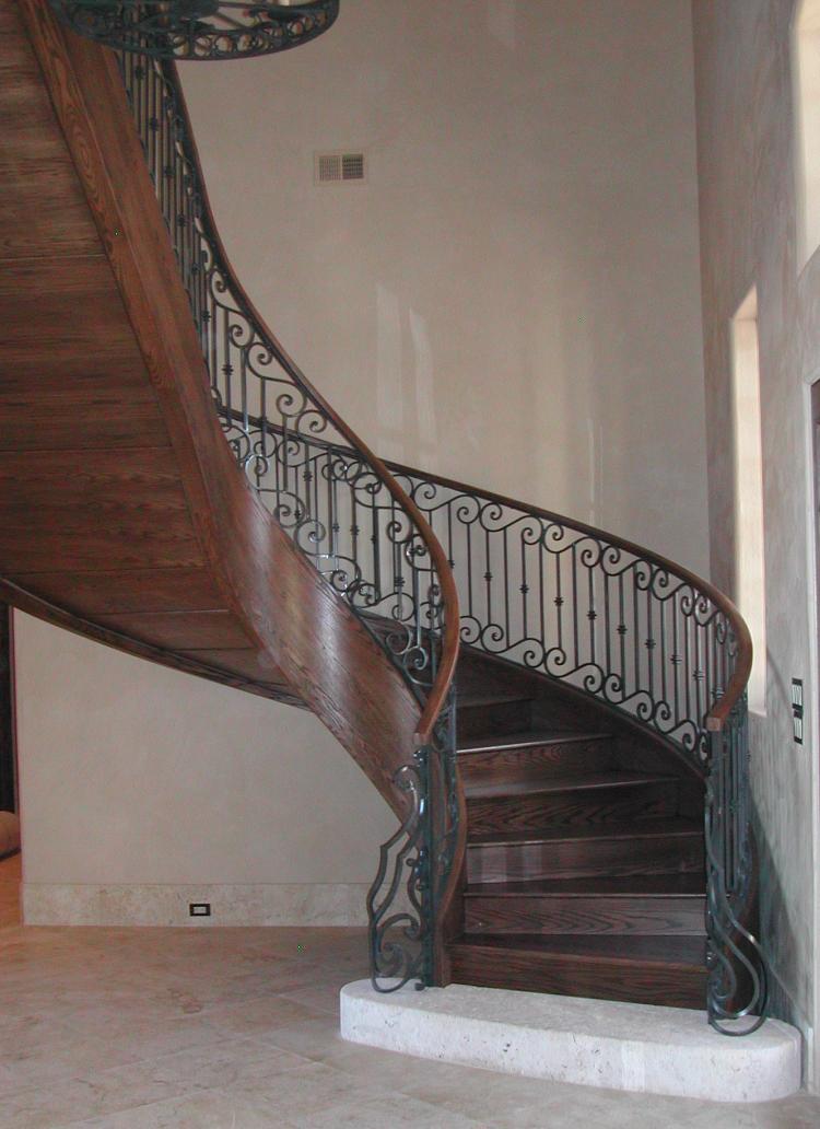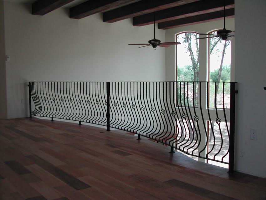 This guardrail features decorative scroll elements with iron posts capped with wood handrail. Stairway has full wood treads and risers with shoe board at second level guardrails. |