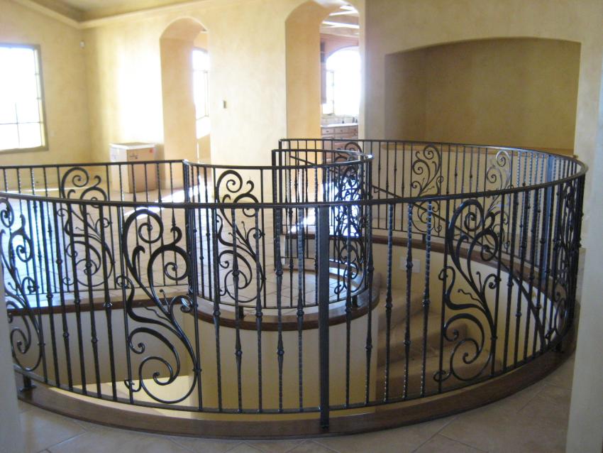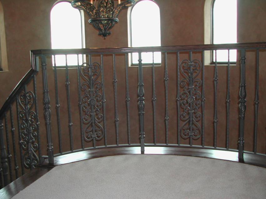 This custom steel balustrade features wood handrail, a combination of decorative scroll elements with double element baluster infill and a combination of metal and wood posts. |