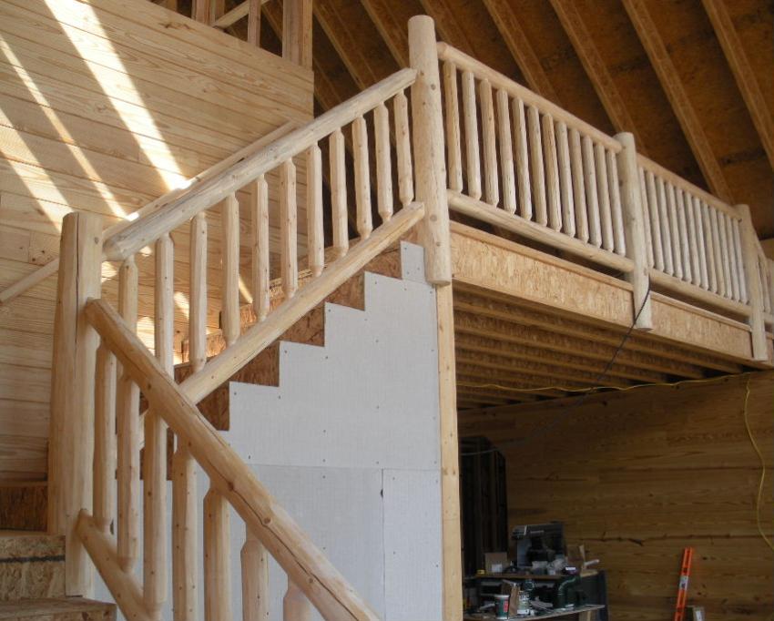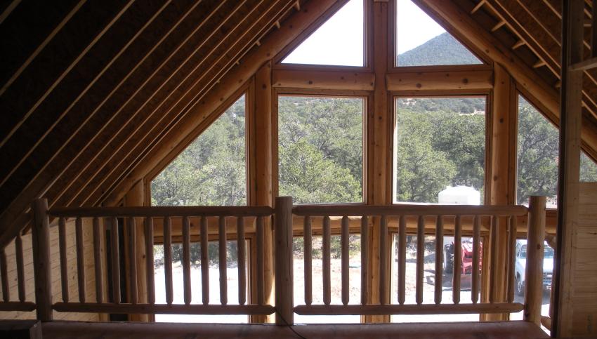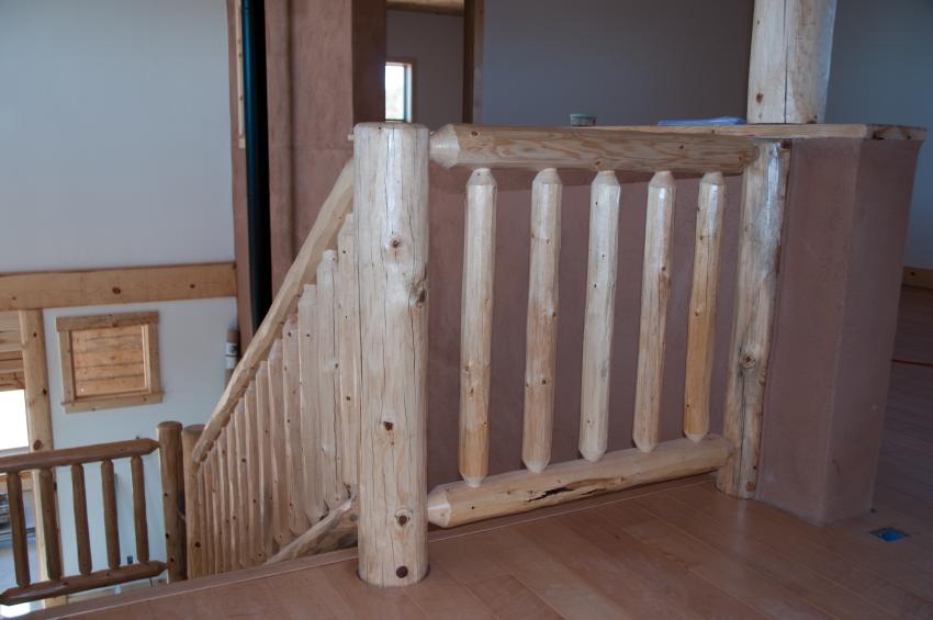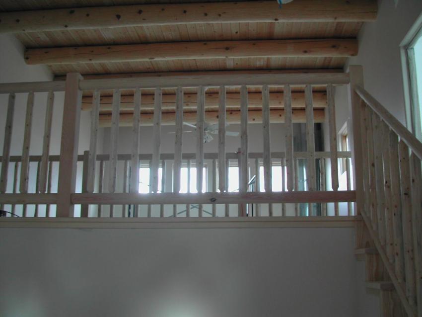 Pine latilla syle balustrade with 3 1/2" S4S pine newel posts, 3" latilla handrail on second level, 2" latilla handrail on stairway with 2" latilla baluster infill. |