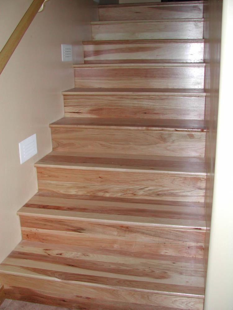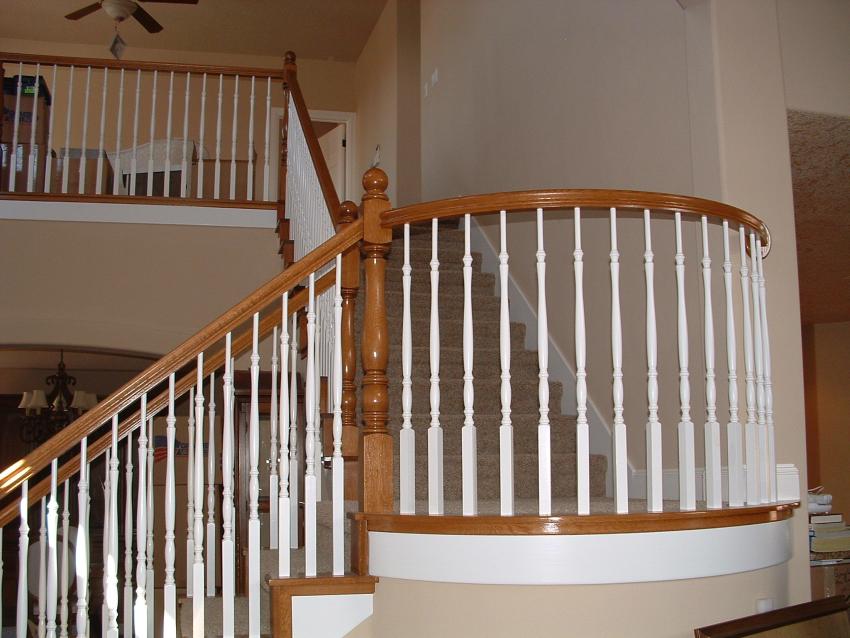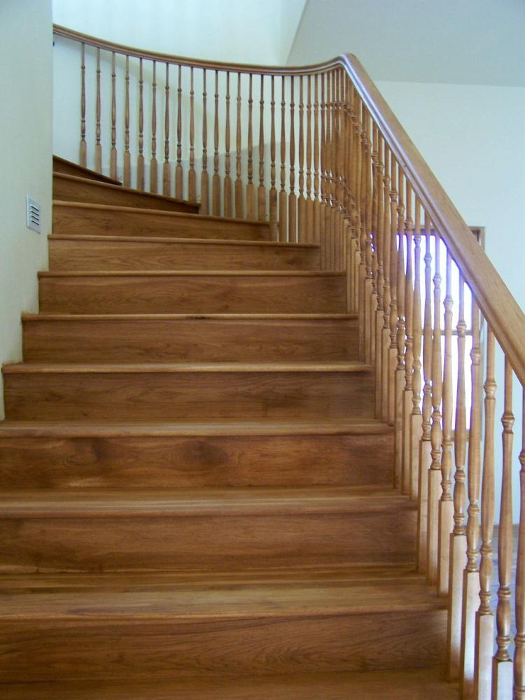 This stairway features Red Oak treads, risers, balusters and handrail. Treads have mitered returns on open side of stairway. |